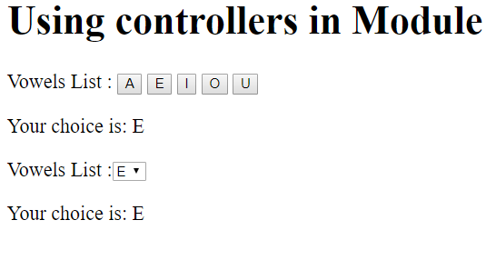 <!DOCTYPE html><html><head><title>Modules and Controllers in Files</title></head><bodyng-app="DemoApp"><h1>Using controllers in Module</h1><scriptsrc=</script><scriptsrc="DemoApp.js"></script><scriptsrc="DemoController"></script><divng-app="DemoApp"ng-controller="DemoController">Vowels List : <buttonng-click="ch('A')">A</button><buttonng-click="ch('E')">E</button><buttonng-click="ch('I')">I</button><buttonng-click="ch('O')">O</button><buttonng-click="ch('U')">U</button><p>{{ choice }}</p>Vowels List :<selectng-options="option for option in list"ng-model="mychoice"ng-change="c()"></select><p>{{ choice }}</p></div></body></html>